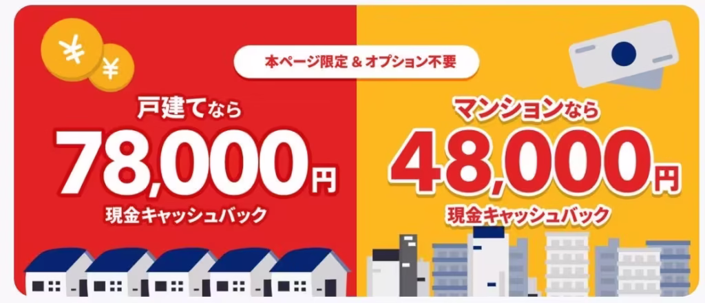キャッシュバックも充実しており、今なら、戸建てで78,000円のキャッシュバックがあります!