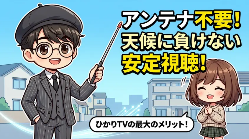 BSアンテナを設置している方なら経験があるかもしれませんが、悪天候でBSが映らなくなるあのストレス、ひかりTVなら無縁です。