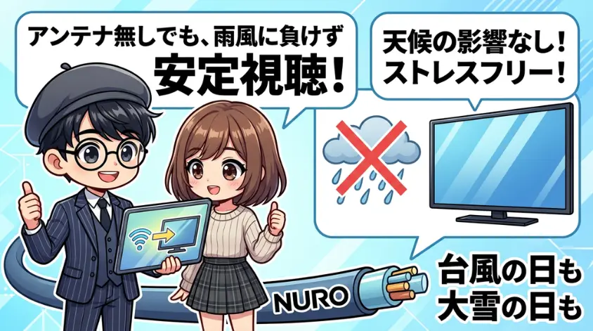 しかし、多彩な専門番組やビデオを楽しみ、天候に左右されない安定感やスマホ視聴を求めるなら、ひかりTV for NUROは非常に魅力的な選択肢となります。