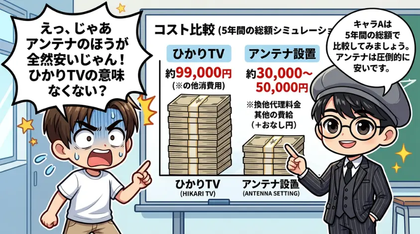 数字だけ見れば、長期的にはアンテナ設置のほうが圧倒的に安いです。