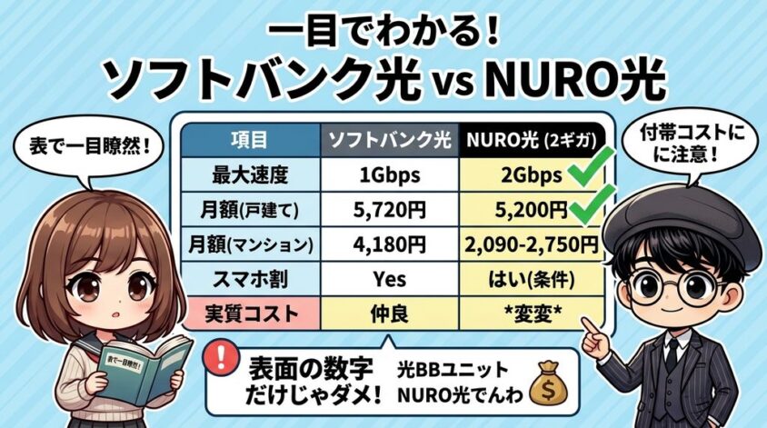 ソフトバンク光とNURO光の基本スペックを一枚で比較