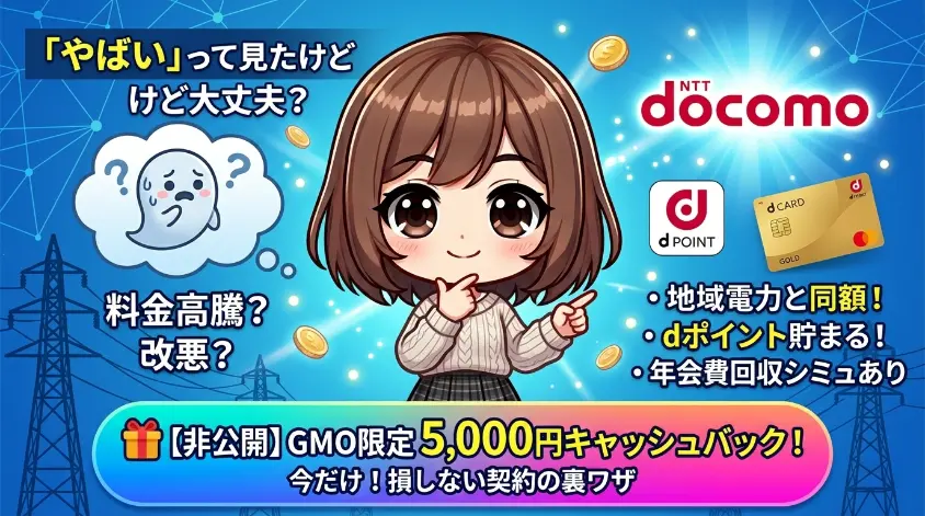 「ドコモでんきってやばいの?」 「SNSで“やばい”って見たけど大丈夫?」――そんな不安を抱えている方へ。 この記事では、ドコモでんきの事実を“料金・ポイント・キャンペーン”の3方向から徹底検証。 損しない契約方法から、GMOとくとくBB経由で最大5,000円... -